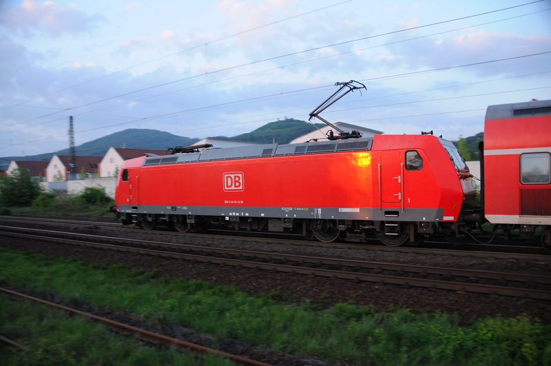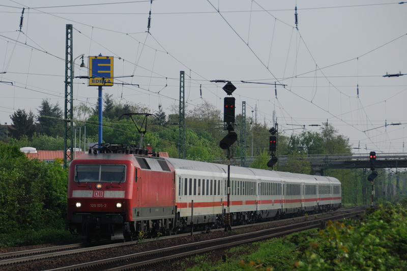 120 105-2 zieht einen IC Darmstadt entgegen. (Bei Auerbach an der Bergstrasse, Anfang Mai 2009).