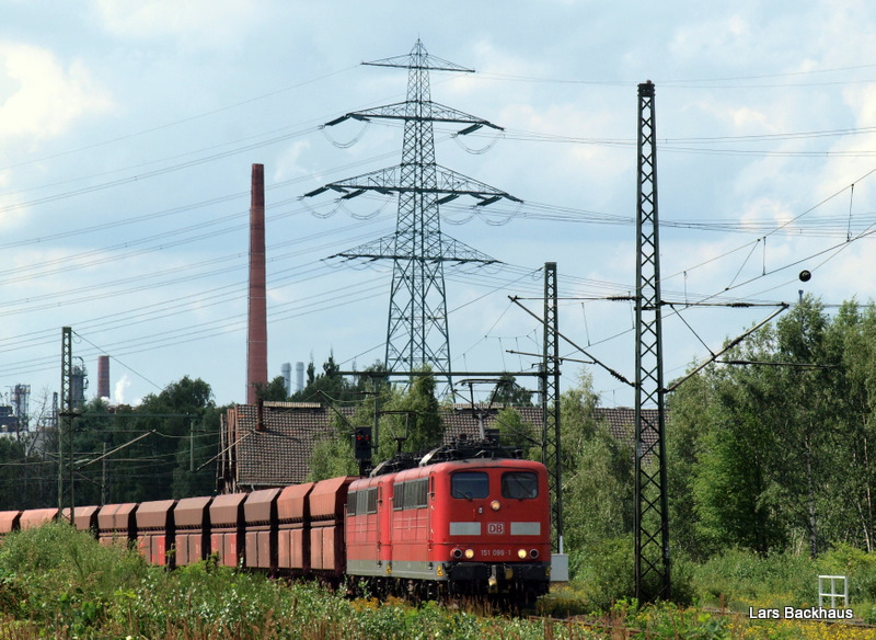 151 146-8 + 151 153-4 ziehen am 6.07.09 einen Erzleerpark von Salzgitter-Beddingen nach Hamburg-Hansaport. Aufgenommen bei der Durchfahrt in Hamburg-Unterelbe.