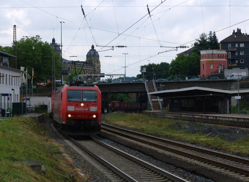 185 171-6 zieht einen Winner-KLV durch Wuppertal-Steinbeck. 11.07.2009