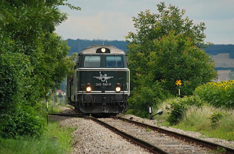 2143.40-0, unterwegs mit EZ 16253 von Ernstbrunn nach Korneuburg. Die Aufnahme entstand am 11.07.2009 kurz vor Korneuburg.
