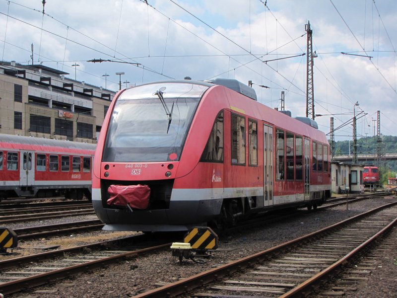 640 019 fährt als RB 93 gerade los in Richtung Bad Berleburg, während 111 099 mit einer RE-Garnitur nach Frankfurt die Mittagsruhe genießt.(Siegen,11.07.09)