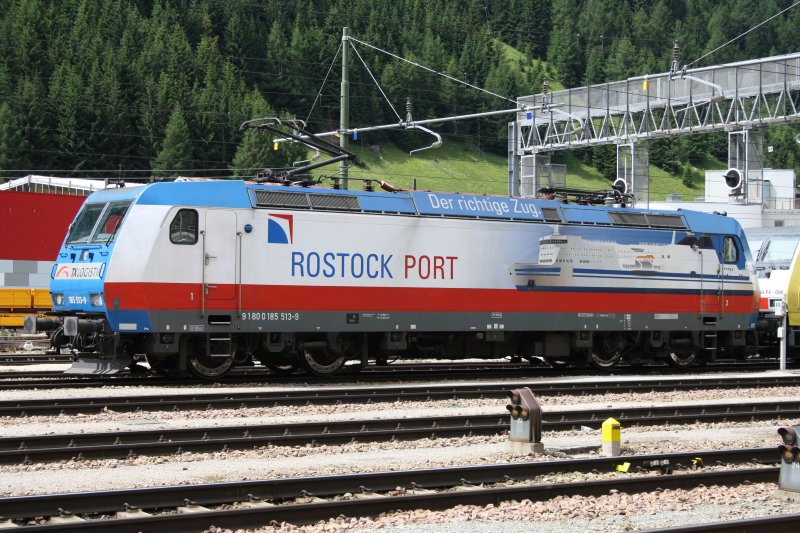 Am Brenner holte 185 513 "Rostock Port" ihren Güterzug Richtung Deutschland ab (05.07.09)