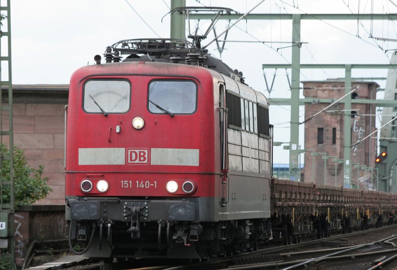 Die BR 151 140-1 hat soeben die Rheinbrücke überquert und fährt weiter in Richtung Köln Gremberg, aufgenommen am 07.07.2009 in Köln bei Steil