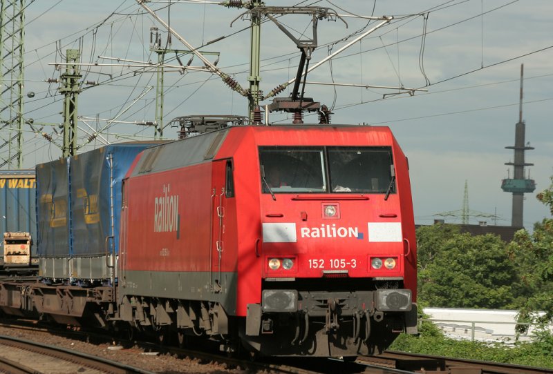 Die BR 152 105-3 zieht einen gemischten Güterzug anschließind über die Rheinbrücke, aufgenommen am 07.07.2009 bei Köln Steil
