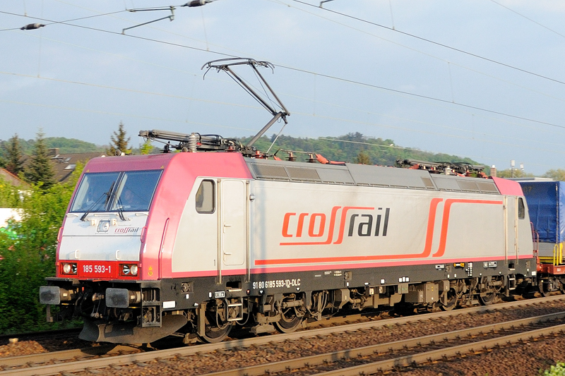 Perfekt ausgeleuchtet: 185 593-1 "Crossrail" im Lokportrait. (Auerbach, Mai 2009).