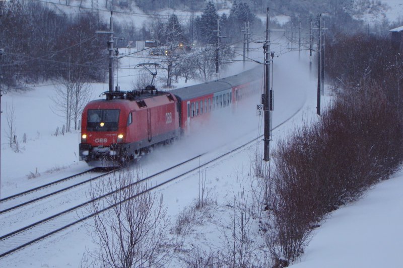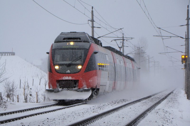 Trotzdem starke Schneefall,nur mit 5 Minute verspätung verkehrte die R5870 von Hochfilzen nach Wörgl am 13.02.2009.