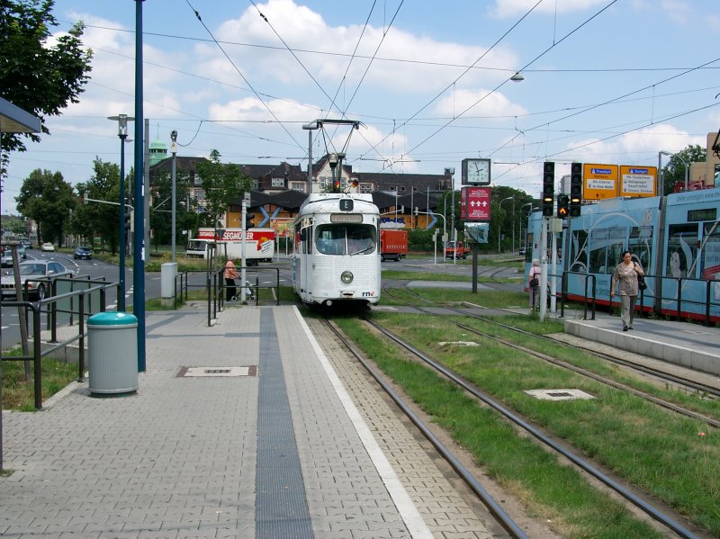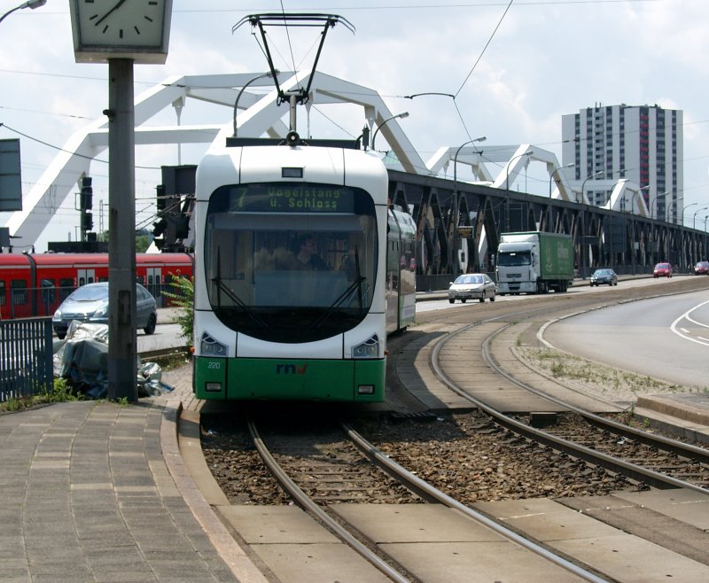 VBL-Variobahn 2220 am 06.07.07 als Linie 7 von LU-Oppau nach MA-Vogelstang bei der Einfahrt an der Haltestelle Konrad-Adenauer-Brücke