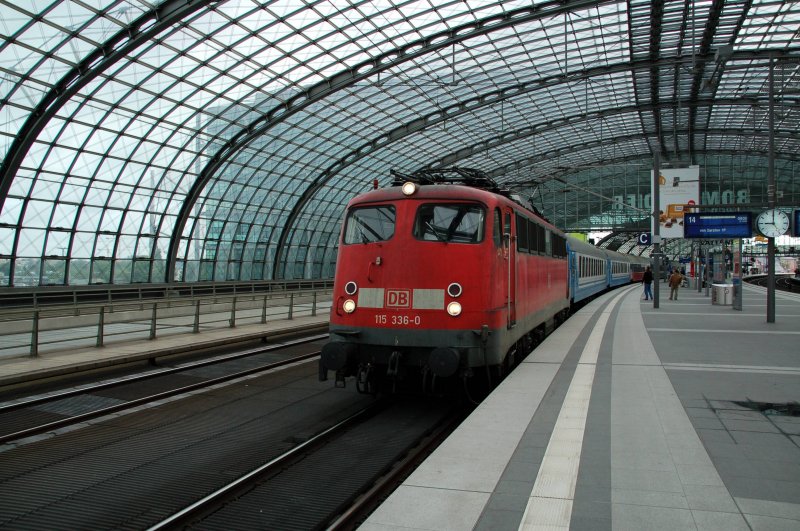 103 325-8 mit dem TEE in Richtung Poznan (Polen) bei der Ankunft im Berliner Hauptbahnhof. Die Bahnhofs-Konservenstimme hatte ihre Probleme mit der Aussprache von "Poznan". 11.7.2009