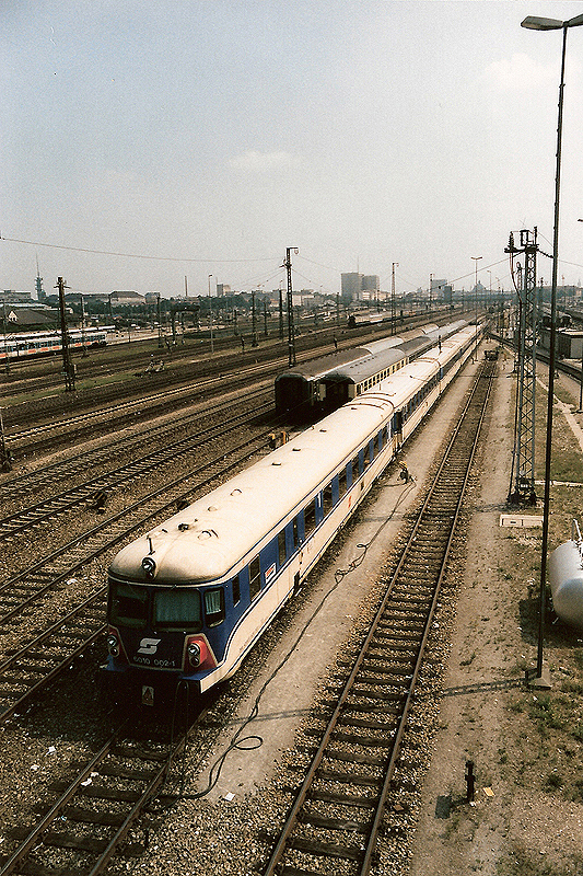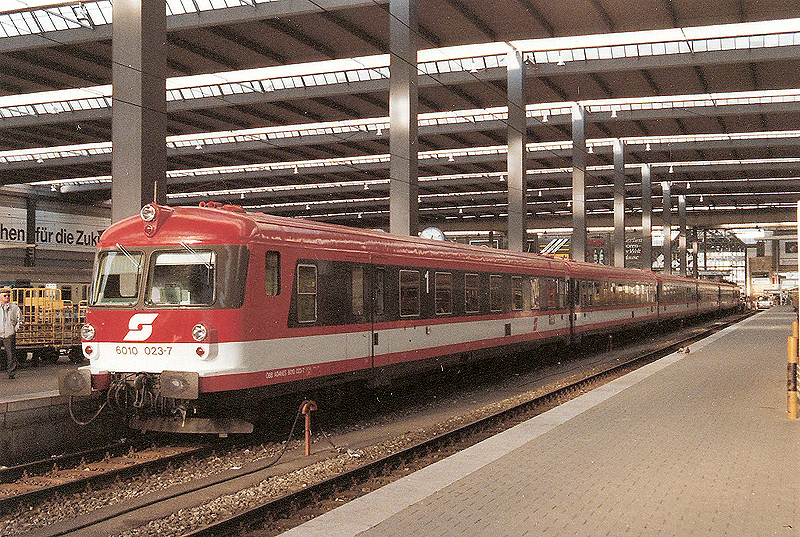 4010/6010 002 am 16. August 1988 hinterstellt im Vorfeld des Münchner Hauptbahnhofs, bis er am Abend wieder nach Wien fährt.