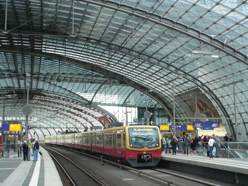 6-Wagen-Zug auf der S7 nach Ahrensfelde. Da bei dieser Baureihe die Achsen alle 7 Tage geprüft werden müssen und nach diesen 7 Tagen keine Fahrgäste mehr transportiert werden dürfen, gibt es nur noch wenige verfügbare Fahrzeuge. Oft sind sie, wie in diesem Falle, verkürzt. Die Höchstgeschwindigkeit wurde bereits von 100 auf 80 km/h heruntergesetzt, Grund hierfür waren allerdings nicht die Achs-, sondern Bremsprobleme. 11.7.2009, Hauptbahnhof