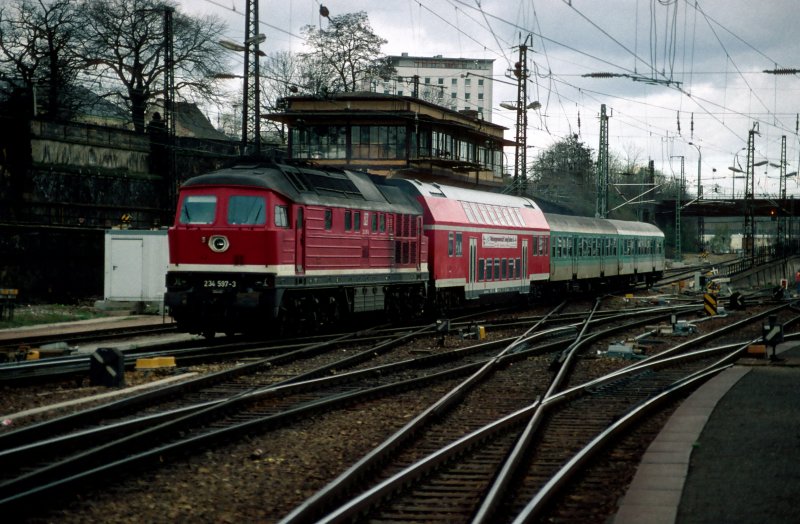 Ab Herbst 1999 bestanden die Zuege auf der Strecke Dresden-Kamenz aus einem Doppelstockwagon und zwei Haelberstaedter. Am 13. April 2000 hat 234 597-3 mit einem Stadtexpress aus Kamenz gerade Dresden Hbf erreicht.