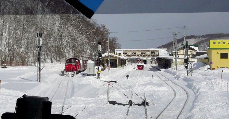DD51 1086 steht im Bahnhof Engaru (Ost-Hokkaido) mit einem Containerzug bereit für die Fahrt über den Pass nach West-Hokkaido. Im Mittelgleis des Bahnhofs steht eine Schneefräse, auf dem Bahnsteigdach sieht man Bahnarbeiter, die den Schnee herabschaufeln. 17.Februar 2009. (Aufnahme durch die verglaste Führerstandsrückwand eines Panorama-Steuerwagens.) SEKIHOKU-HAUPTLINIE