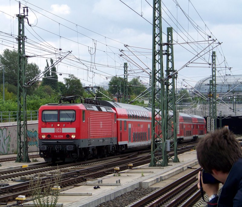 114 003-7 zieht am 11.7.2009 den RE 3 nach Elsterwerda. Hier erreicht sie die Nordeinfahrt von Berlin Hbf.