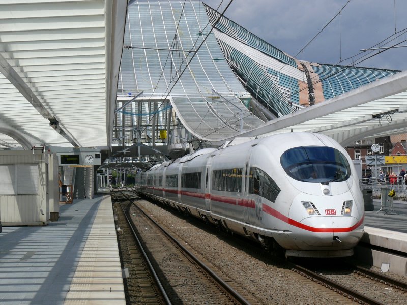 Der ICE 4604 (406 004-2) Bruxelles-Midi - Frankfurt Flughafen hat den lichtdurchfluteten Bahnhof von Liège-Guillemins erreicht, und wird pünktlich um 13.14 Uhr weiterfahren. Planmässige Ankunft in Frankfurt ist 15.22 Uhr (das dazu passende Video wurde auch hochgeladen). Aufgenommen am 12/07/2009.