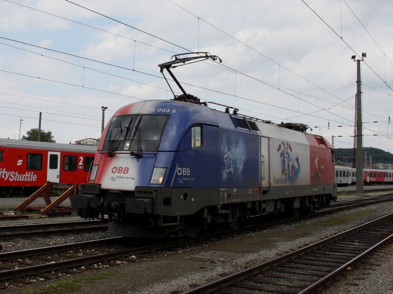 Die 1116 003 (EM Frankreich) am 11.07.2009 bei einer Rangierfahrt in Salzburg Hbf.