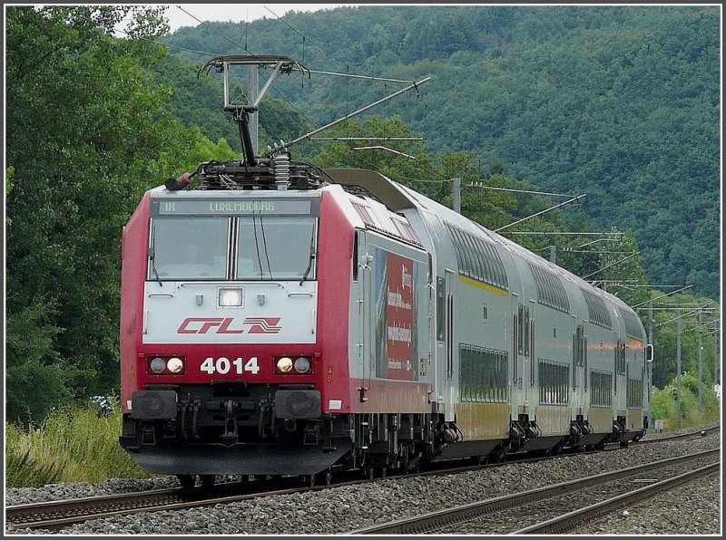 Die 4014 mit ihrer neuen Werbung für den Fotowettbewerb www.photos-luxembourg.lu, braust am 11.07.09 durch Erpeldange/Ettelbrück auf ihrer Fahrt von Troisvierges nach Luxemburg. (Jeanny)