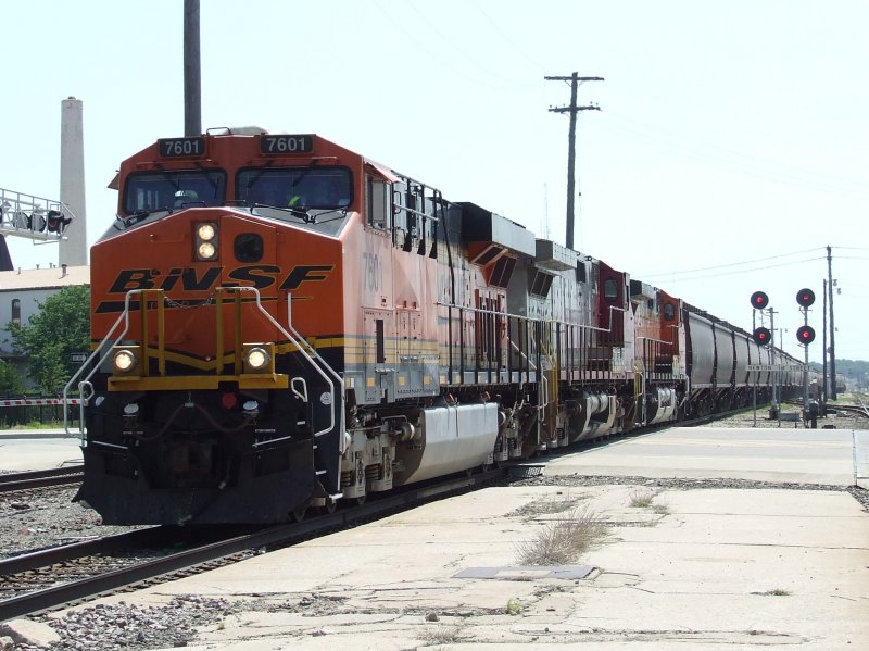 Eine 3er Traktion BNSF Dieselloks zieht einen 110 Wagen Getreidezug durch Newton, Kansas am 09.07.2009.