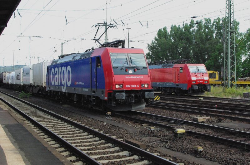 Frisch aus dem Rbf Bebra ausgelaufen: 482 048-6 der SBB Cargo mit Containerzug. Daneben abgestellt 189 049-0. 11.07.2009.