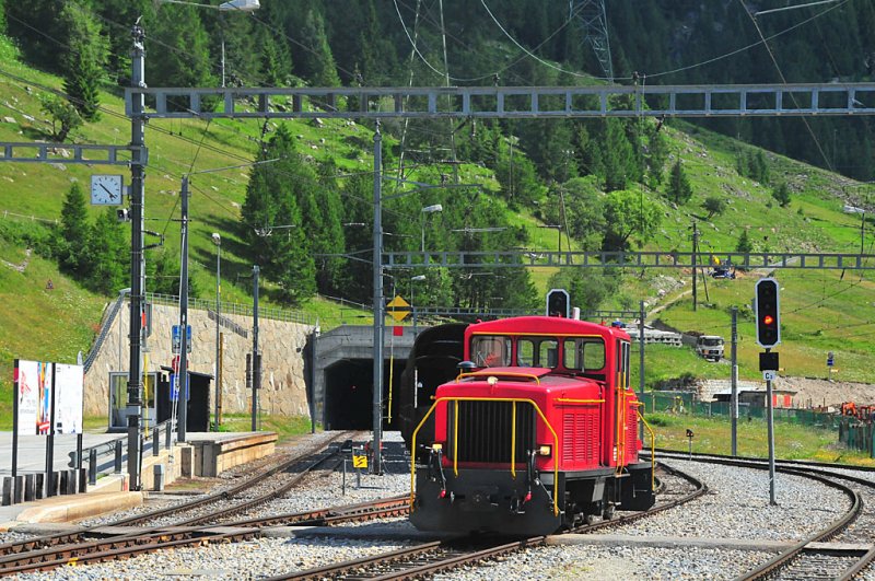 Die Gm 4/4 verschwindet im Schuppen in Oberwald. Links der 2. Autozug wartet auf seinen Einsatz. 8.7.09