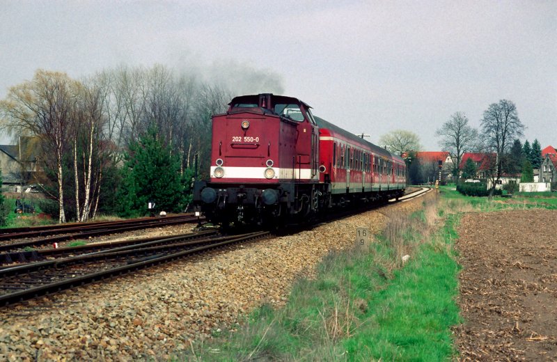 In 2000 kam es immernoch dazu, dass bei Ausfall einer Br219 wieder mit einer Br202 auf Strecke Dresden-Koenigsbrueck gefahren wurde. Am 15. April fuhr 202 550-0 mit einer RegionalBahn aus Koenigsbrueck an einem Gleisanschluss bei Lausnitz vorbei.