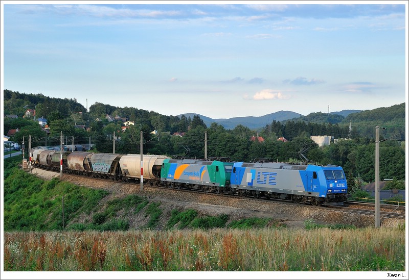LTE 185.528 + 185.xxx mit einem Getreidezug westwärts. Dürrwien, 12.7.2009 (abends). Schönen Gruß zurück an den freundlichen Tfzf!