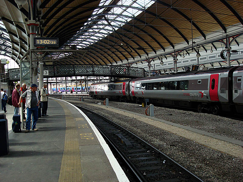 Während wir auf unseren Zug warten, setzt sich auf dem gegenüber liegenden Gleis ein Cross country Voyager-Triebzug in Bewegung. Bahnhof Inverness, 15. Aug. 2008