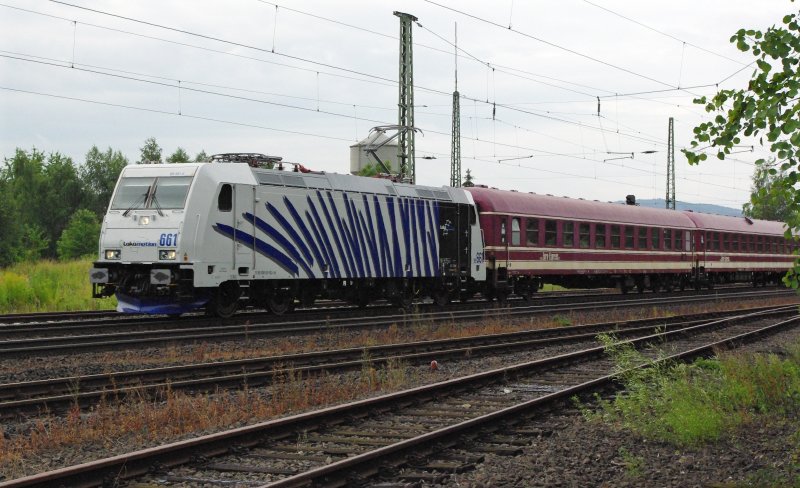 Was für ein Glück, dank der Vormeldung konnte endlich das neue scheue Zebra der Lokomotion abgelichtet werden. Es handelt sich um 185 661-6 mit SZ 2222 nach Wolfsburg. Hier in Eschwege West am 12.07.2009.