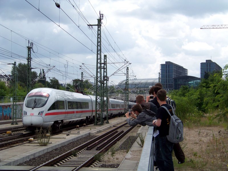 Wie die Hühner auf der Stange sucht hier jeder das beste Motiv auf seiner Cam. Jedenfalls hat jeder den ICE-T bei der Einfahrt in den Berliner Hbf im Blick und bestimmt auch auf die Chipkarte gebrannt. 11.07.2009