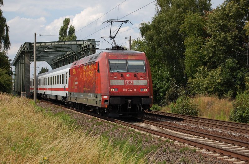 101 047-9 "150 Jahre Feuerwehr" mit IC nach Überquerung des Mittellandkanals bei Peine am 15.07.2009