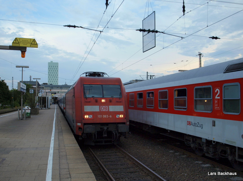 101 063-6 steht am 6.07.09 mit dem EN 491 "Hans Albers" Hamburg-Altona - Wien Westbahnhof in Hamburg-Altona auf Gleis 11 zur Abfahrt Richtung Hamburg-Dammtor bereit. Rechts im Bild steht der AZ 1379 nach Lörrach. Planmäßig müsste hier eigentlich der Taurus des IC "Königssee" vorgespannt sein. Da der "Königssee" auf Grund von Bauarbeiten zwischen Hamburg und Hannover aber zurzeit in Hannover endet, wird dieses Zugpaar in dieser Zeit von 101ern gefahren.