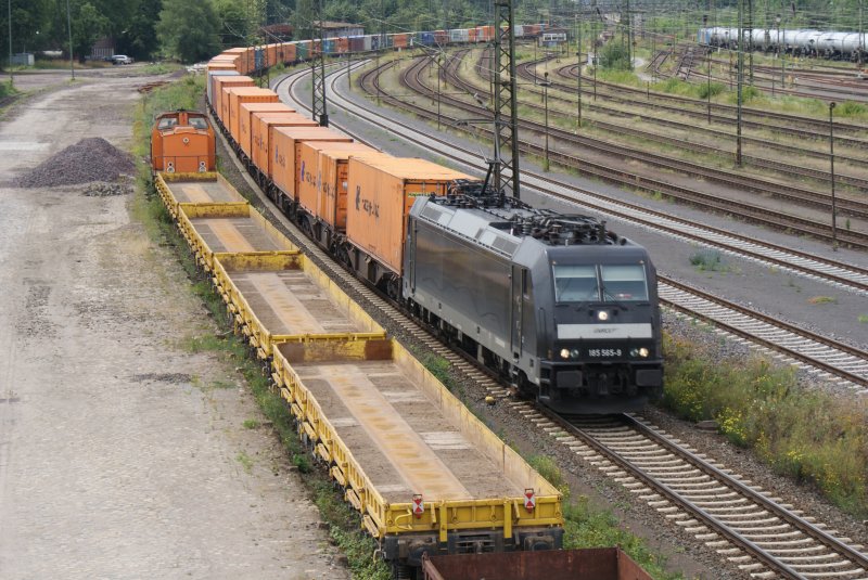 185 565-9 der MRCE mit eienm Containerzug bei der Einfahrt in den Seelzer Rbf. am 07.07.2009.Links rangiert eine BR 277 Flachwagen.