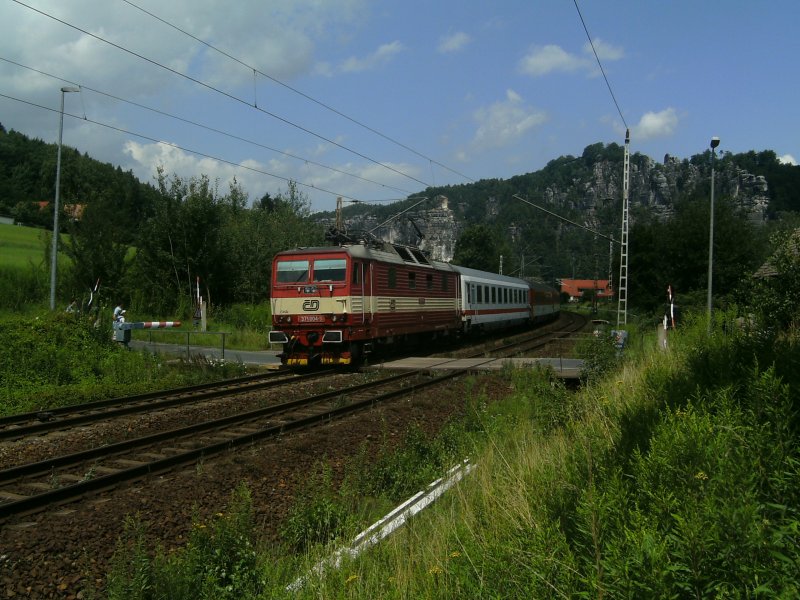 143 883 bei der Ausfahrt in Königstein Richtung Dresden am 16.Juli 2009.