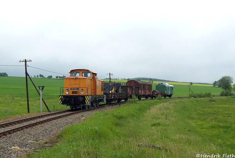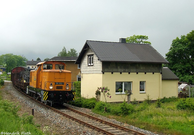 Am 22.05.2009 rollt 106 992 mit DGS 91915 ins den ehem. Bahnhof von Scheibenberg.