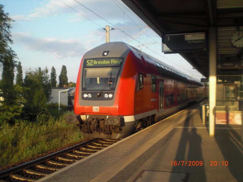 Die S2 ist soeben im Haltepunkt Dresden - Reick eingetroffen und fährt weiter Richtung Dresden Flughafen. Aufnahme: 16.07.2009