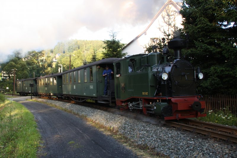 Die sächsische Nachbau IK 54 war am Abend des 15.07.09 auf Testfahrt unterwegs. Hier hat sie gerade dem Bahnhof Schmalzgrube in Richtung Jöhstadt verlassen.