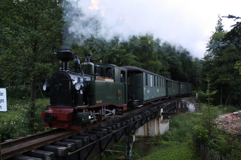 Die sächsische Nachbau IK 54 war am Abend des 15.07.09 auf Testfahrt unterwegs. Hier hat sie gerade auf der Brücke kurz vor Schlössel. Die Lok "bellt" ganz schön bei angestrengter fahrweise!
