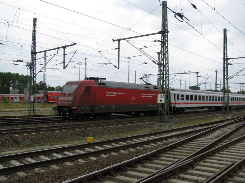 E-Lok BR 101 045-3 der DB AG mit EC 76 fährt im Bahnhof Wittenberge ein, 12.07.2009