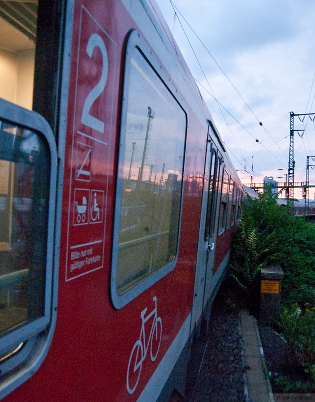 E pericoloso spoghersi. "Nicht hinauslehnen" stand an den Wagenfenstern. Seitdem der Gleiskörper nicht mehr vernünftig gepflegt wird, hat es eine neue Bedeutung bekommen. Der Busch im Mittelgrund ist eine Robinie und hat sehr spitze und starke Dornen. Daher ist nur die Kamera draußen und der Fotograf beobachtet die Strecke. Auf diese Weise bleiben solche Fotos erlaubt und ungefährlich. Das war es mit dem gespiegelten Frankfurt. Blick aus RB 15232 bei der Einfahrt nach Frankfurt Hbf. (13. Juli 2009). Ich hoffe auch mit dem gleichen aber doch nicht gleichen Motiv nicht zu sehr die Nerven zu strapazieren. Wem es nicht gefällt, der melde sich.