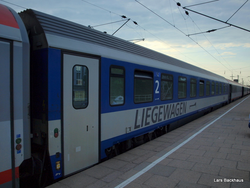 Ein Liegewagen der ÖBB Bauart Bcmz steht am 6.07.09 eingereiht im EN 491 "Hans Albers" Hamburg-Altona - Wien Westbahnhof in Hamburg-Altona auf Gleis 11.