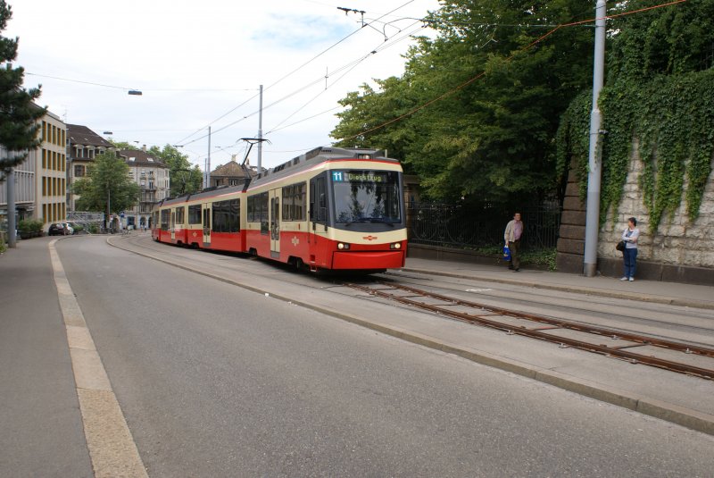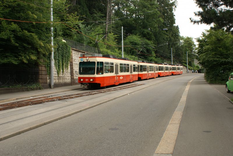 Ein Tramersatzzug bestehend aus den Be 4/4 51, 52, 54 und 53 nähert sich am 12.7.09 der provisorischen Haltestelle Stadelhofen.