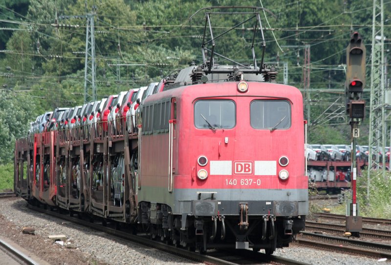 Endlich nochmal ein par BR 140 in Köln West, darunter auch 140 637-0 zieht einen langen Autozug durch Köln West am 11.07.2009