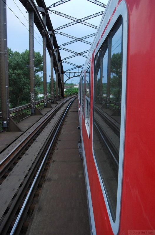Gespiegeltes Frankfurt. Blick aus RB 15840 in die Bogenbrücke über dem Main zwischen Frankfurt Ost und Frankfurt Süd. (13. Juli 2009)
