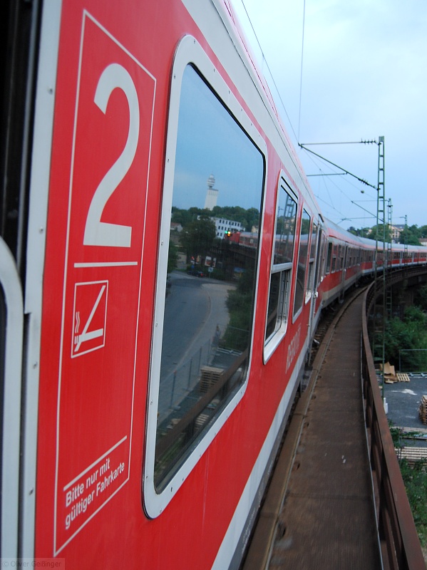 Gespiegeltes Frankfurt. Blick aus RB 15232 kurz nach der Mainbrücke mit dem markanten Henninger Turm bei der Einfahrt nach Frankfurt Süd. (13. Juli 2009)