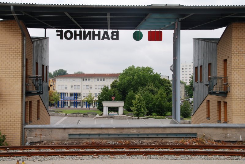 HENNIGSDORF (Landkreis Oberhavel), 05.07.2009, Blick vom S-Bahnsteig auf den Bahnhofsvorplatz