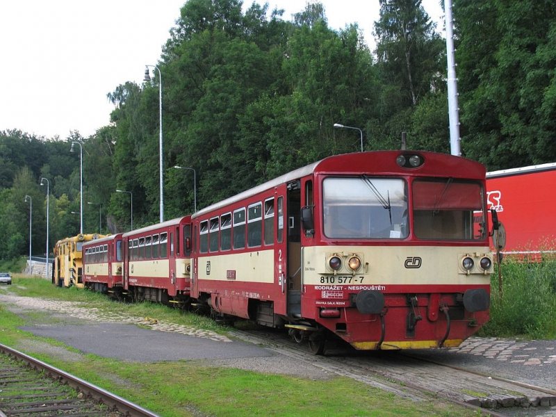 Motorwagen 810 577-7 und zwei weitere Brotbuchsen würden fertiggestellt auf Bahnhof Tanvald am 13-7-2009.