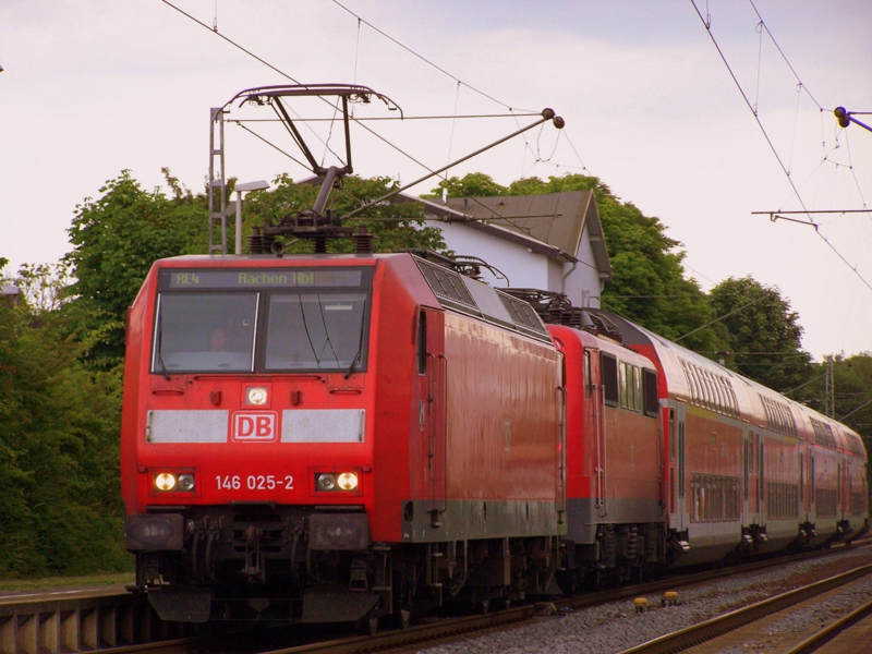 Nach dem Fahrplanwechsel am 14.12.08 sidn keine Loks der baureihe 146.0 auf dem RE4 im Einsatz, ausser wenn mal wieder eine 111 nicht das tut, was sie tun soll. Hier zieht 146 025-2 den RE4 mit der defekten 111 116 aus dem Geilenkirchener Bahnhof heraus in Richtung Aachen.