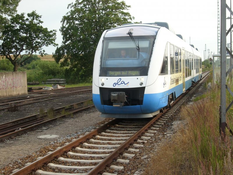 Nur noch wenige Meter und OLA-Triebwagen 701 hat am 15.Juli 2009 die Endstation Bergen/Rügen erreicht.