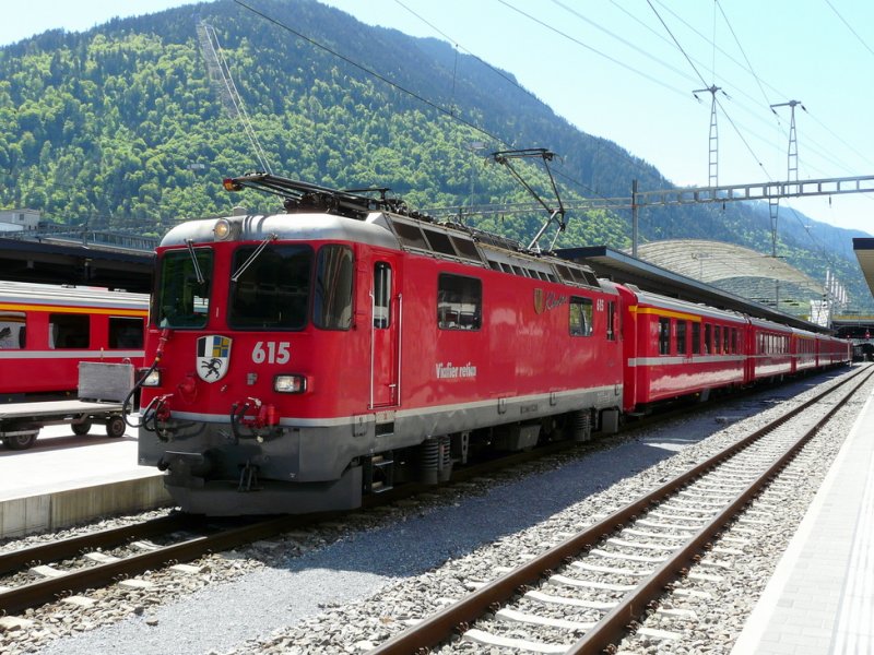 RhB - Ge 4/4 615 vor Schnellzug im Bahnhof von Chur am 07.05.2009