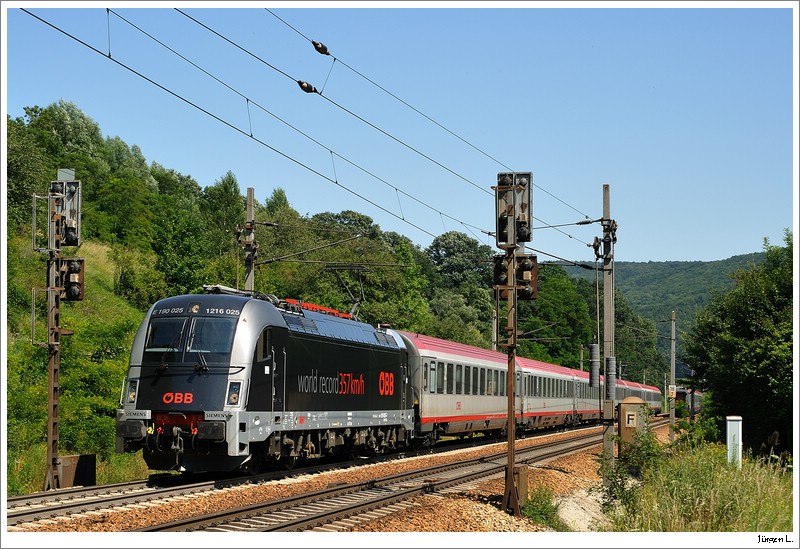 ÖBB 1216 025 (word record 357km/h) mit dem OIC692 auf der Rückreise von Wien nach Salzburg. Tullnerbach-Pressbaum, 14.07.2009