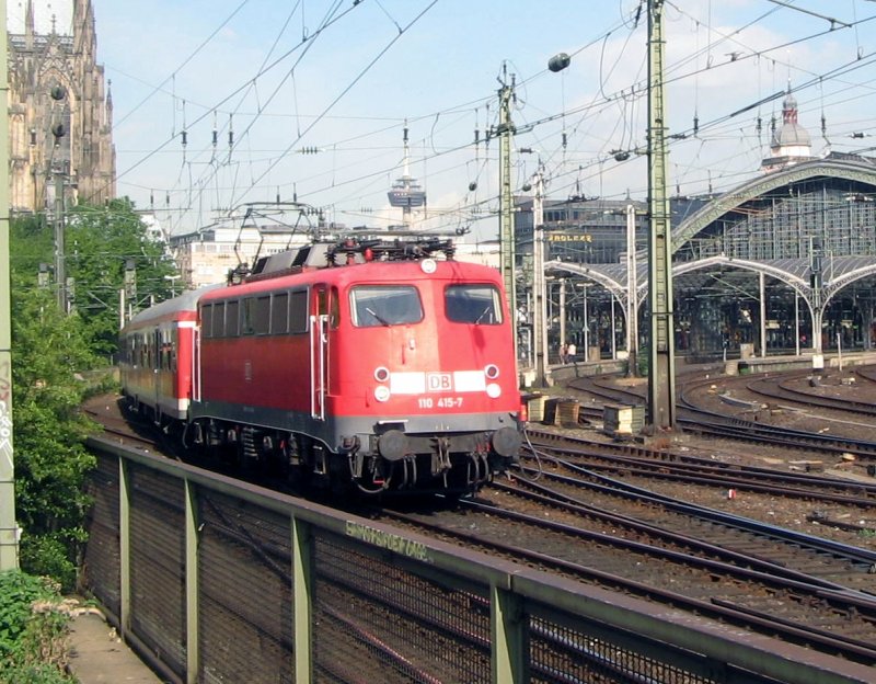 110 415-7 hat gerade den Hauptbahnhof Köln verlassen um die Fahrgäste nach Siegen zu bringen. Schade ist es, dass man heutzutage in Köln nur noch sehr selten die schönen Bügelfalten sieht. (17.7.2009)
